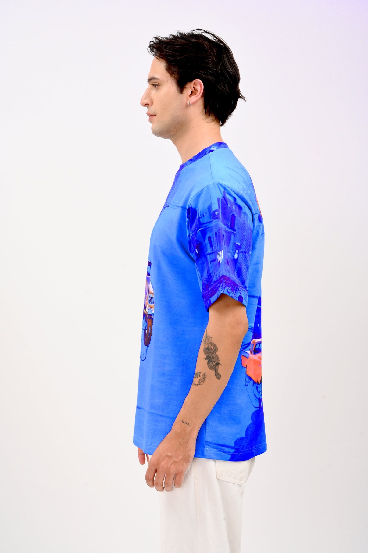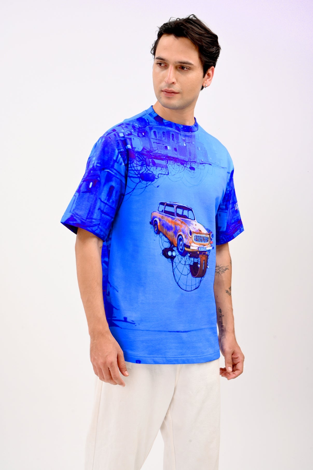 Cars Xi is a visual liberation — a dreamlike moment where old-world machines soar above a neon-blue skyline. It captures that strange yet familiar inner state: where you're no longer grounded by fear, but lifted by clarity. This shirt represents the inner shift — when you begin to move, not to escape, but because you finally can.
